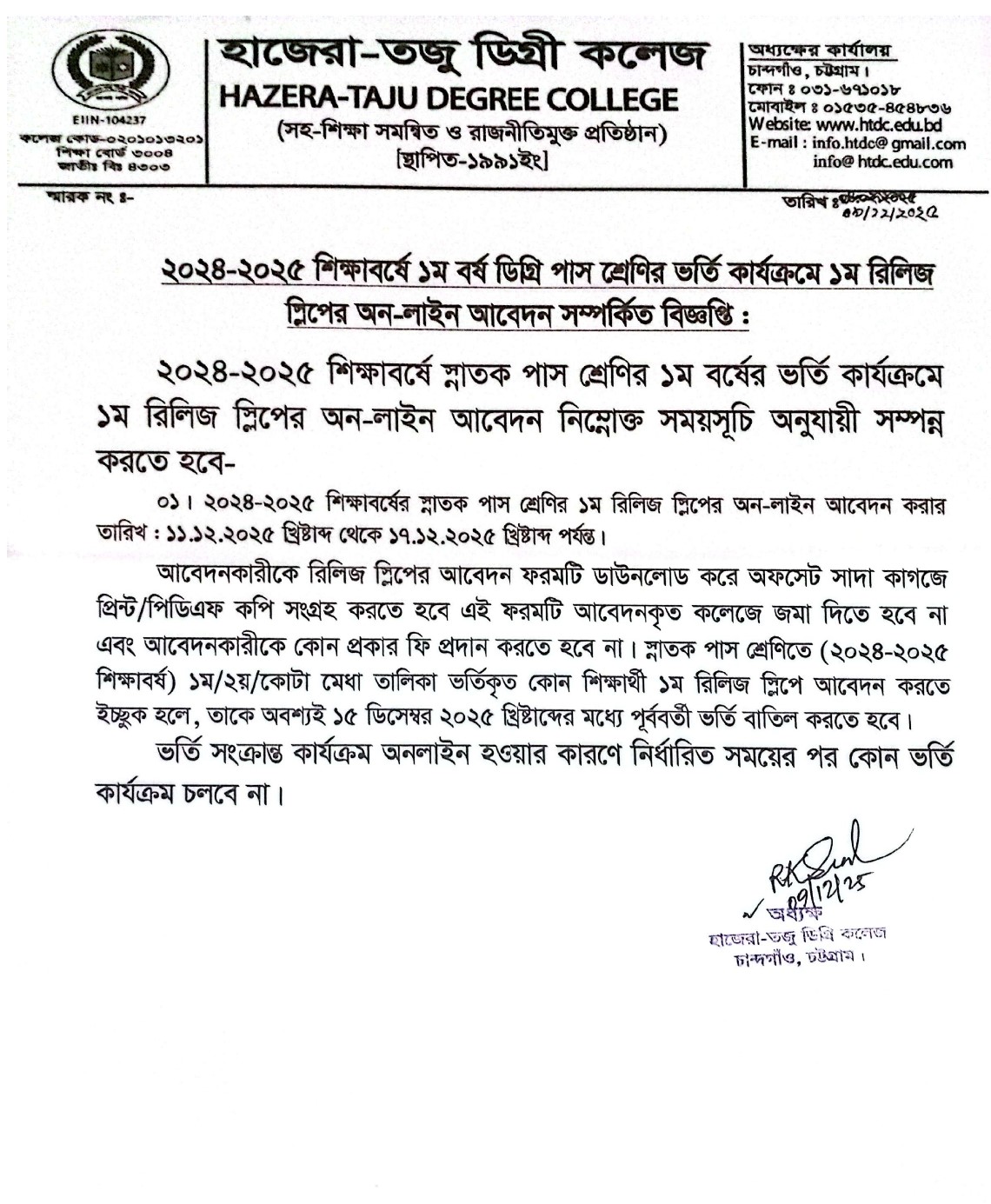 | ২০২৪-২০২৫ শিক্ষাবর্ষে অনার্স ১ম বর্ষে রিলিজ স্লিপে অনলাইনে আবেদন সংক্রান্ত বিজ্ঞপ্তি Active New General | 2025-08-31 | Download |