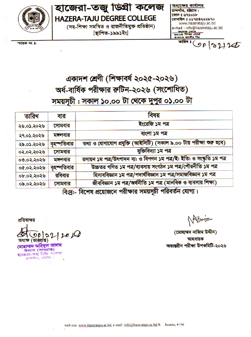 | একাদশ শ্রেণি (২০২৫-২০২৬) অর্ধ-বার্ষিক রুটিন-২০২৬ (সংশোধিত) Active New General | 2026-01-11 | Download |